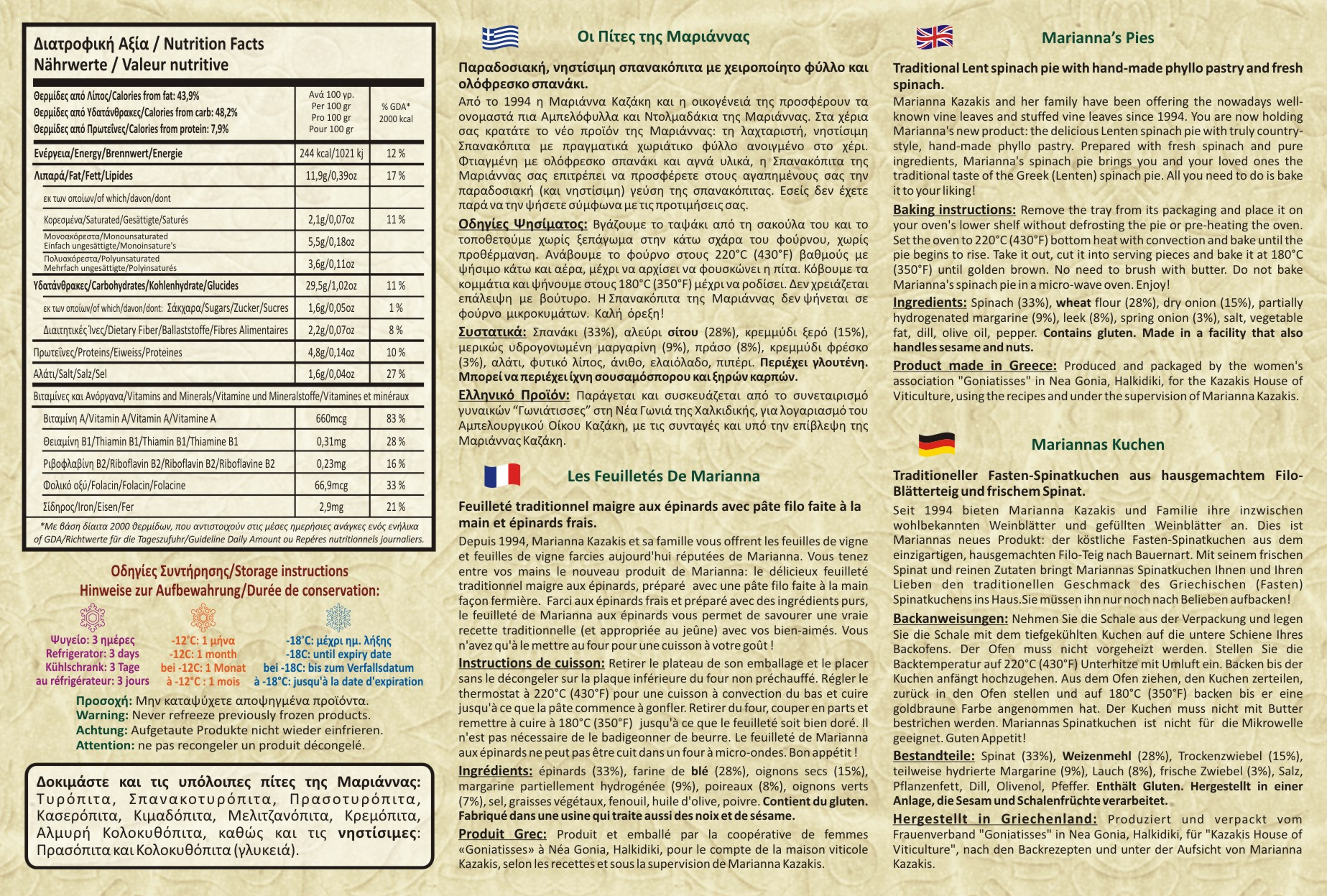 Η χωριάτικη σπανακόπιτα Μαριάννας παρασκευάζεται στο χέρι από τον συνεταιρισμό Γωνιάτισσες στη Νέα Γωνιά της Χαλκδικής, με παραλαβή φρέσκων υλικών καθημερινά. Περιέχει 470 γραμμάρια σπανάκι ανά κιλό πίτας, δίνοντας το πραγματικό νόημα στη λέξη «σπανακόπιτα».