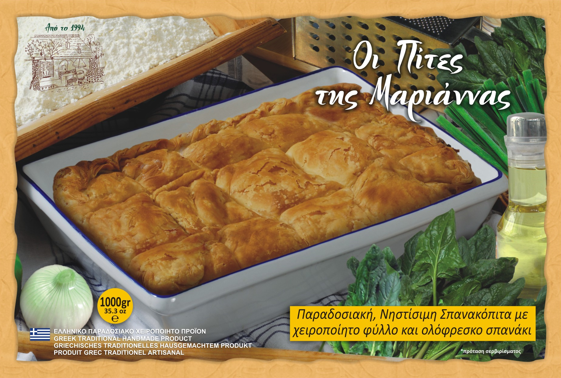 Η Χειροποίητη Σπανακόπιτα Μαριάννας διατίθεται σε πρακτικό ταψάκι, έτοιμο να μπει στο φούρνο, σε συσκευασία των 1000 γρ.: